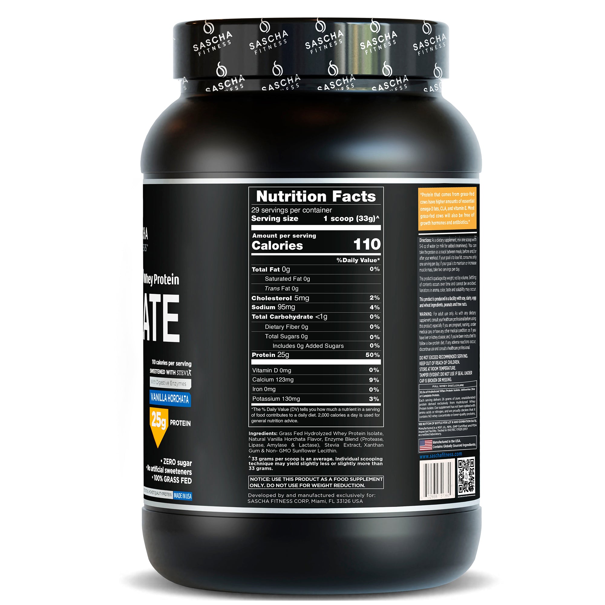 Whey protein comes from milk, has all the essential amino acids and is one of the best proteins in terms of quality. These are some of the benefits: Helps regenerate and increase muscle mass. Helps with fat loss while preserving muscle tissue. And also helps to control appetite and improve performance. There are mainly two types of protein: Whey Concentrate and Whey Isolate. The main difference is in their levels of purity. Whey Concentrate: is 80% protein and contains more fat and lactose which is milk sugar. Whey Isolate: is 98% protein, It's much more pure, is free of lactose and fat. We chose Whey Isolate and we hydrolyzed it to offer you an outstanding supplement. Whey hydrolyzed is predigested whey protein isolate that’s easily absorbed by your body and virtually free of any potential allergens. To further improve the quality of our product we’ve also added digestive enzymes! They can significantly improve digestion and help alleviate digestive disorders, constipation, gas and bloating. Also helps convert food into energy source. With Sascha Fitness Hydrolyzed Whey Protein Isolate we guarantee a delicious taste and one the best quality in the market Our products are manufactured by a cGMP( Current Good Manufacturing Practice ) certified facility which is also FDA inspected.